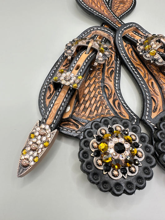Sporenriemen Set Zweifarbig Damen Western - Russet/Black mit Strass-Beschlägen „Black Tea“