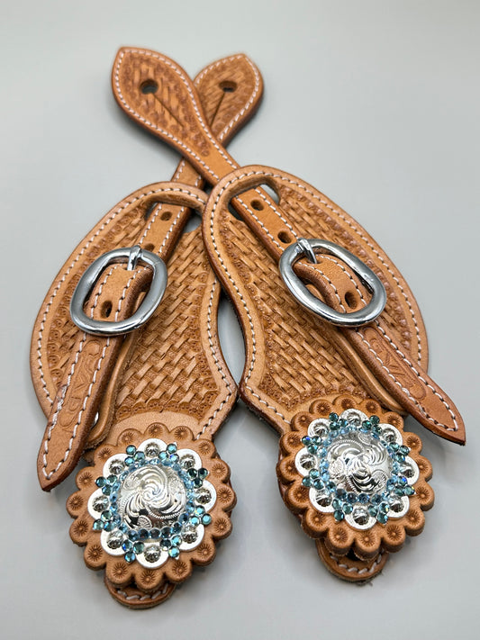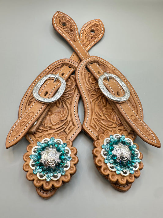 Sporenriemen Set Damen Western - Russet mit individuellen Conchos in türkis