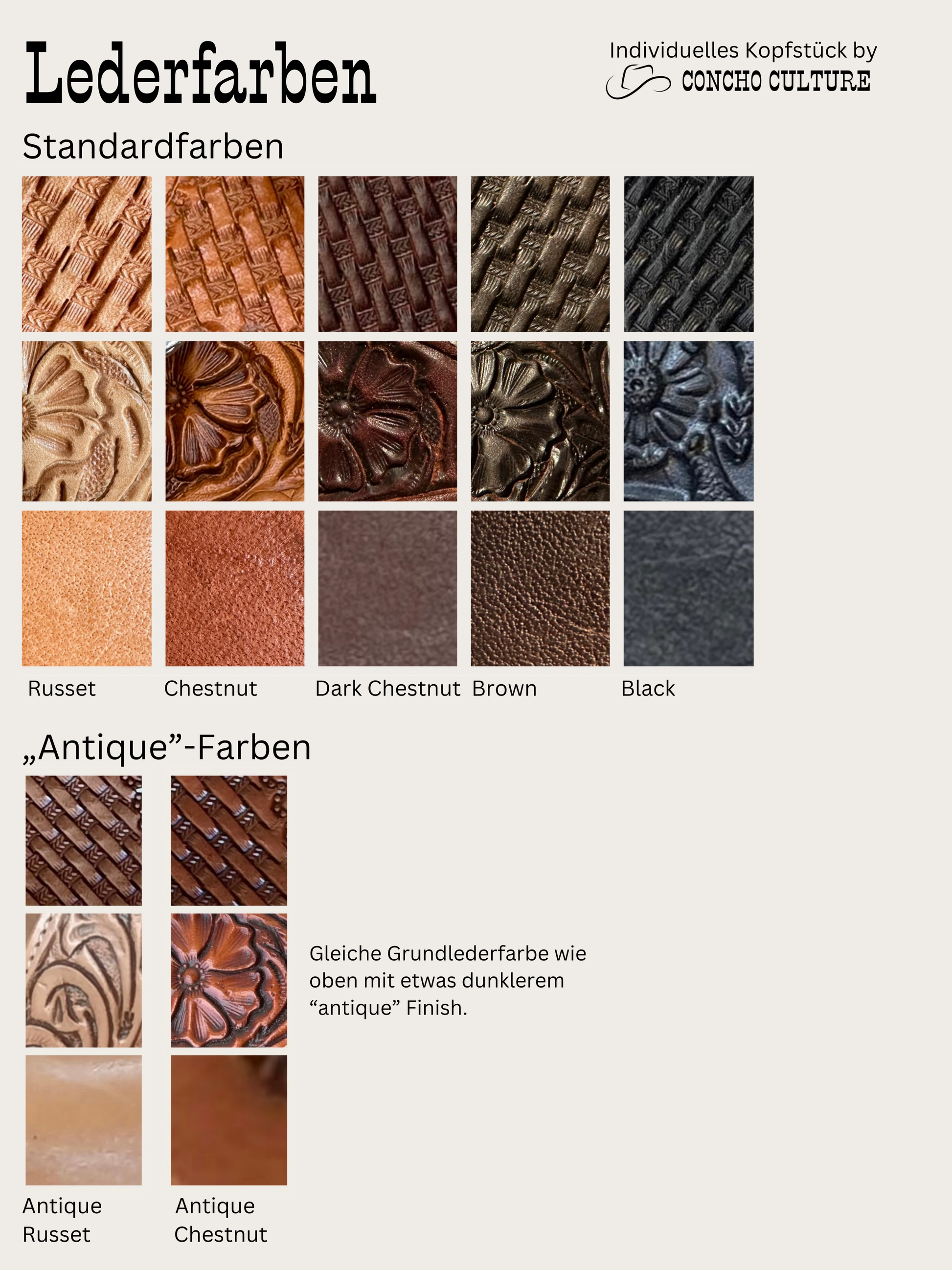 Kann auf Wunsch gegen Aufpreis mit (Strass-) Conchos und Buckle Sets geliefert werden. Bitte kontaktiere uns hierzu über das Kontaktformular.